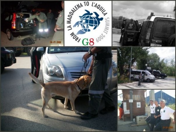 Dopo aver lavorato lunedì 6 e martedì 7 Luglio al Campo di Coppito, effettuando una serie di bonifiche, il Team K9 è stato accreditato al Corpo Interforze. Ha quindi svolto un lavoro di bonifica agli automezzi in transito verso la sede del G8, in un check point, comandato dai Carabinieri, nonchè missioni specifiche su richiesta, nella cerniera di massima sicurezza.